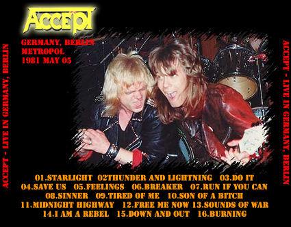 1. Midnight Highway 2. Free Me Now 3. Drum Solo / Free Me Now (reprise) 4. Sounds of War 5. I'm a Rebel 6. Down and Out 7. Burning