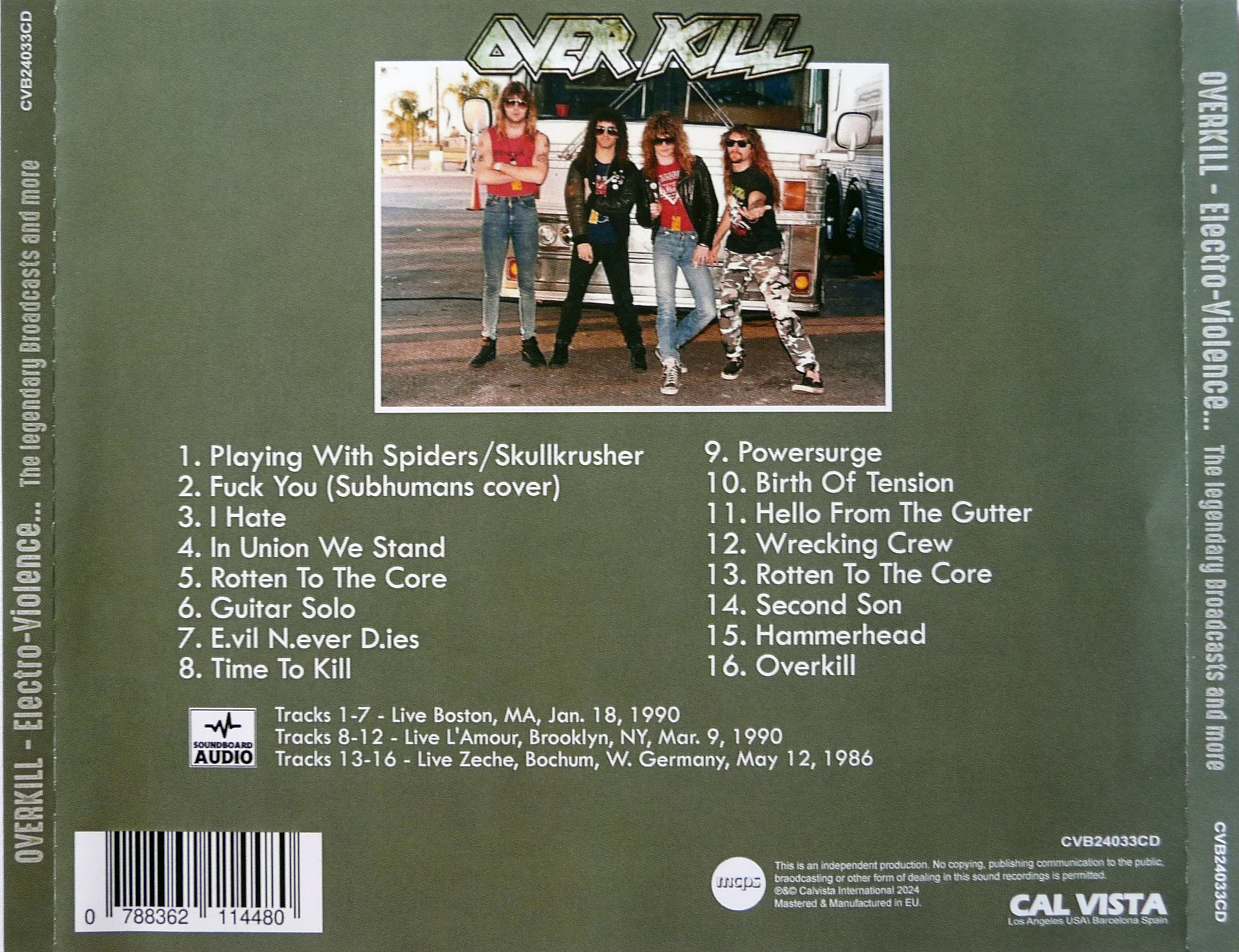 BOSTON 1990 (The Channel, Boston, MA, U.S.A. 18/01/1990) 1. Playing with Spiders / Skull Krusher 2. Fuck You - Band Members 3. I Hate 4. In Union We Stand 5. Rotten to the Core 6. Guitar solo 7. E.vil N.ever D.ies BROOKLYN 1990 (L'Amour, Brooklyn, NY, U.S.A. 01/01/1990) 8. Time to Kill 9. Powersurge 10. Birth of Tension 11. Hello from the Gutter / Wrecking Crew BOCHUM 1986 (Zeche, Bochum, Germany 12/05/1986) 12. Rotten to the Core 13. Second Son 14. Hammerhead 15. Overkill