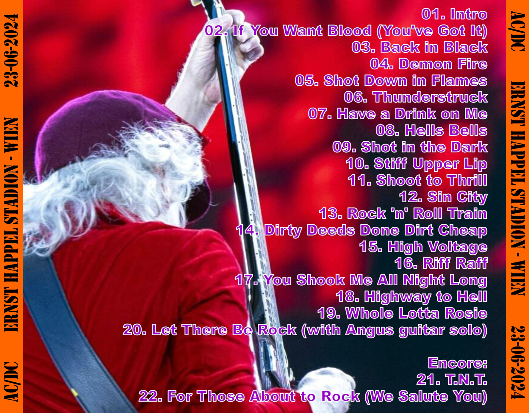 1. Intro 2. If You Want Blood (You've Got It) 3. Back in Black 4. Demon Fire 5. Shot Down in Flames 6. Thunderstruck 7. Have a Drink on Me 8. Hells Bells 9. Shot in the Dark 10. Stiff Upper Lip 11. Shoot to Thrill 12. Sin City 13. Rock 'n' Roll Train 14. Dirty Deeds Done Dirt Cheap 15. High Voltage