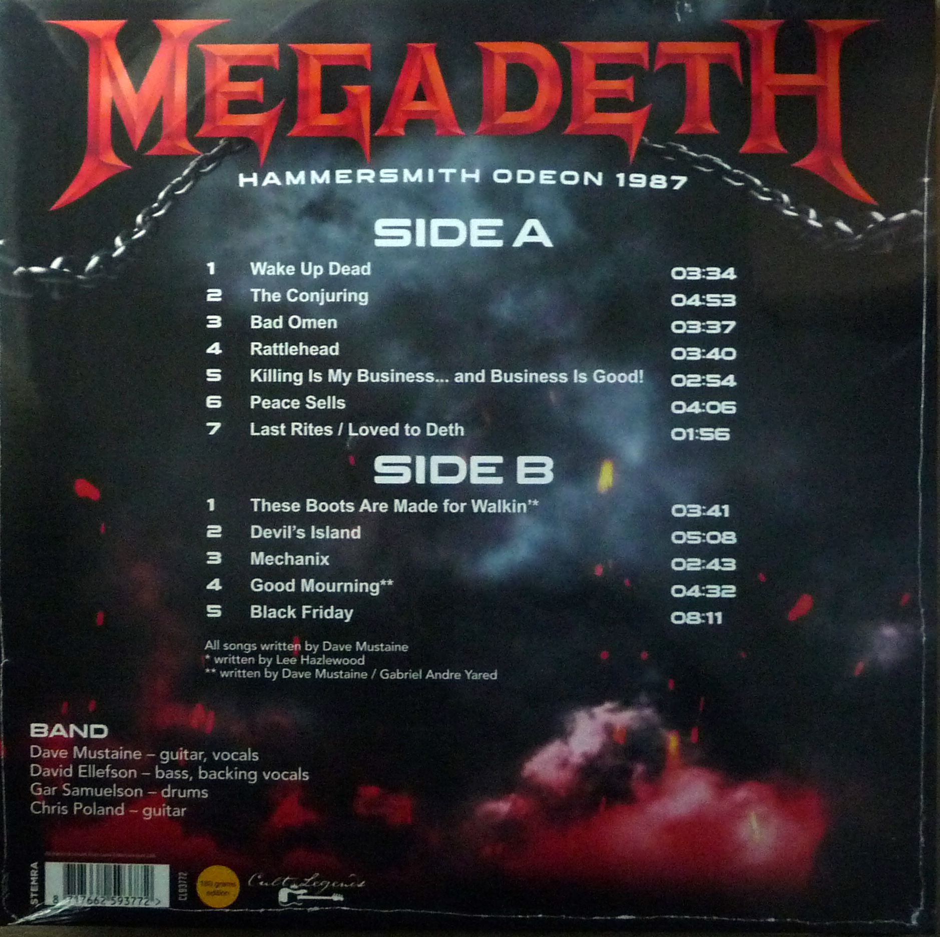 Best of Megadeth Live at Hammersmith Odeon. Black vinyl. Tracklist on cover & label is incorrect. Mechanix strangely appears twice on the LP, an error of course. Above is correct. The actual song order of what they played that night is: A3, A4, A5, A6, B1, B2, B3, B4, B5, B6, A1, A2