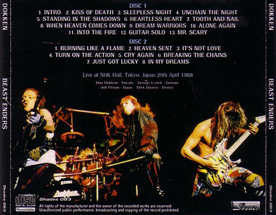 1. Intro 2. Kiss of Death 3. Sleepless Night 4. Unchain the Night 5. Standing in the Shadows 6. Heartless Heart 7. Tooth and Nail 8. When Heaven Comes Down 9. Dream Warriors 10. Alone Again 11. Into the Fire 12. George Lynch Guitar Solo 13. Mr. Scary (instrumental)