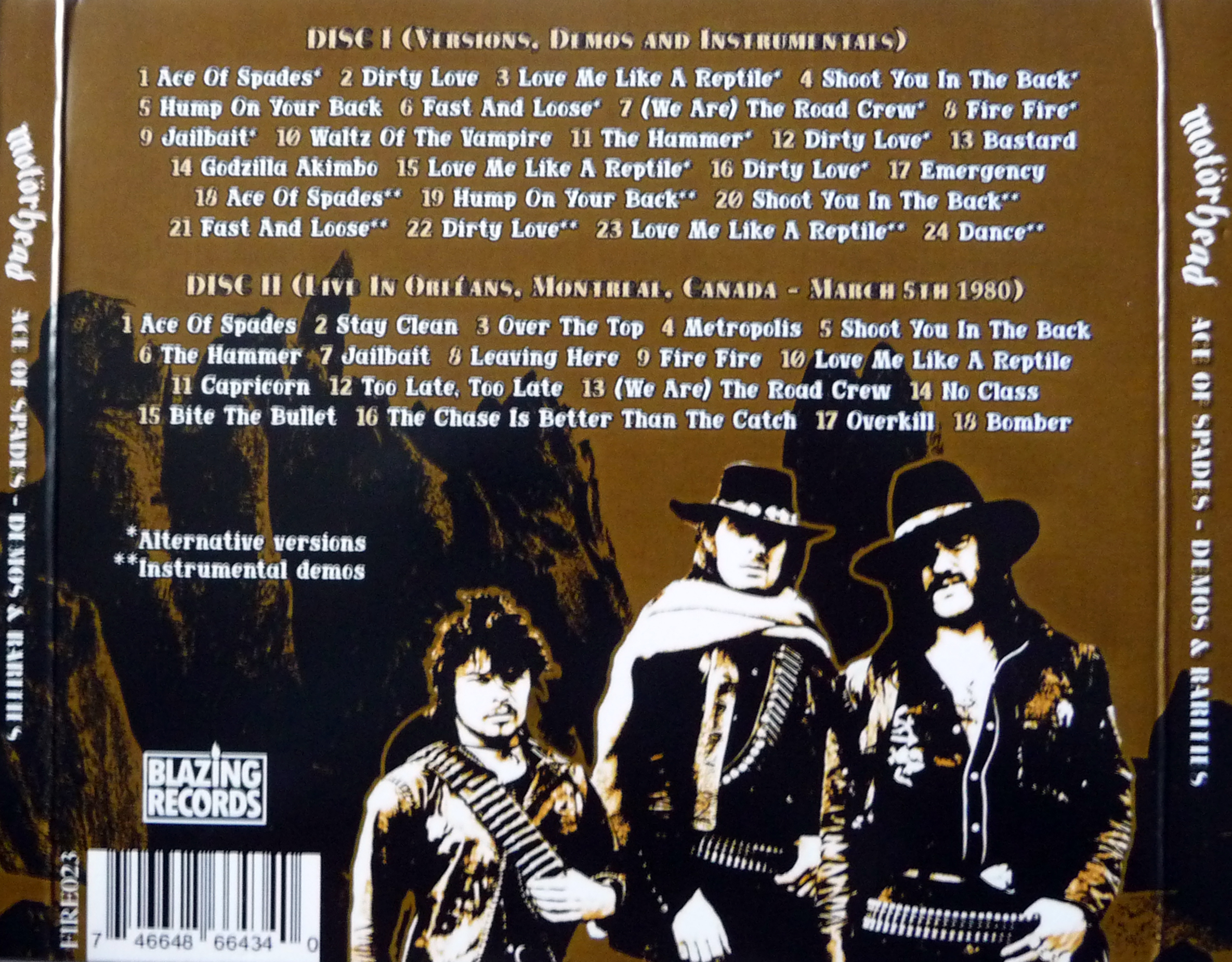 1. Ace of Spades 2. Dirty Love 3. Love Me Like a Reptile 4. Shoot You in the Back 5. Sump on Your Back 6. Fast And Loose 7. (We Are) The Road Crew 8. Fire Fire 9. Jailbait 10. Waltz of the Vampire 11. The Hammer 12. Dirty Love 13. Bastard 14. Godzilla Akimbo 15. Love Me Like a Reptile 16. Dirty Love 17. Emergency 18. Ace of Spades 19. Hump on Your Back 20. Shoot You in the Back 21. Fast and Loose 22. Dirty Love 23. Love Me Like a Reptile 24. Dance