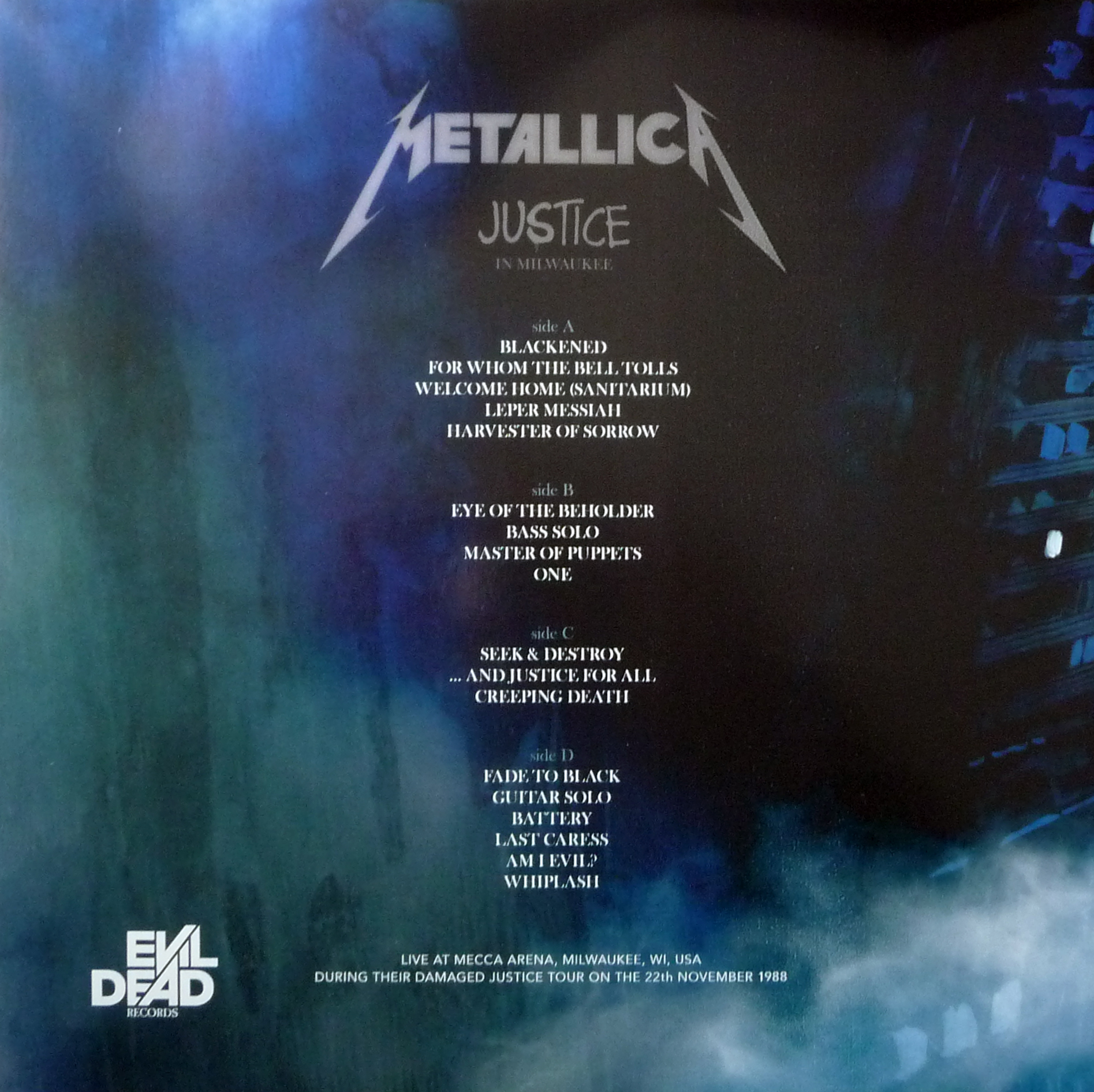 A1. Blackened A2. For Whom the Bell Tolls A3. Welcome Home (Sanitarium) A4. Leper Messiah A5. Harvester of Sorrow B1. Eye of the Beholder B2. Bass Solo B3. Master of Puppets B4. One