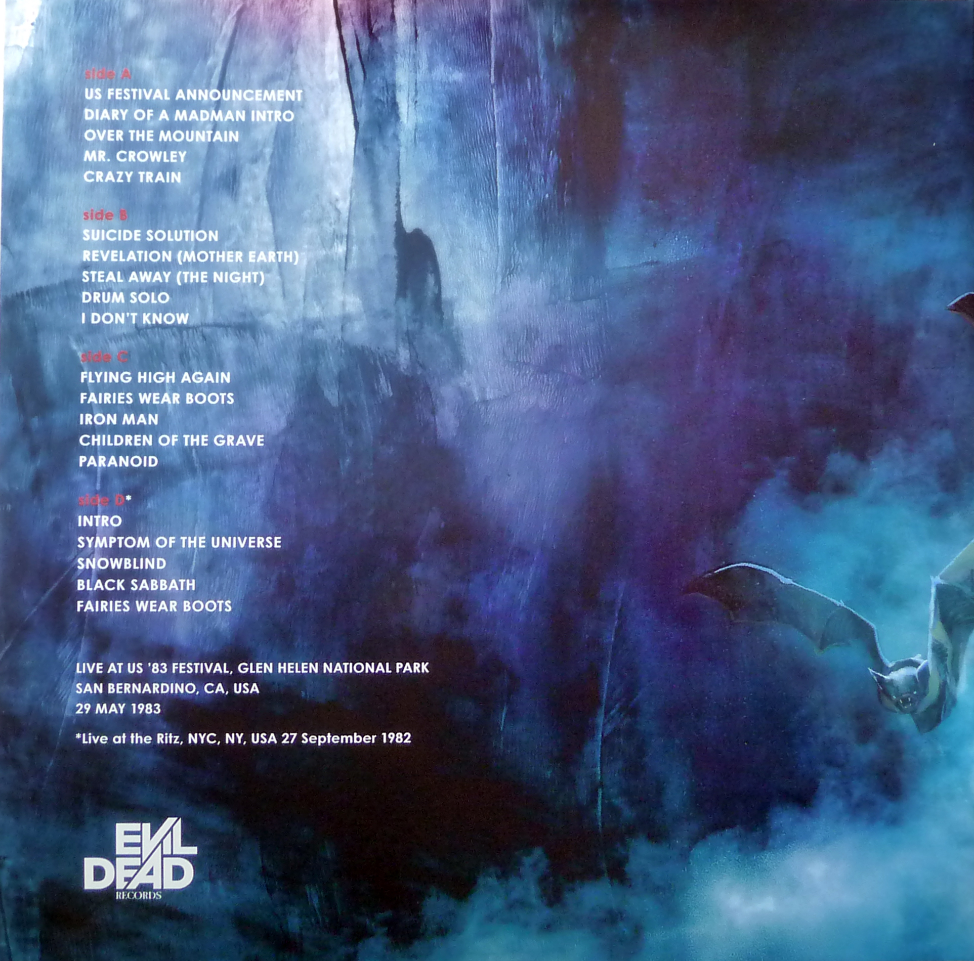 A1. US Festival Intro A2. Diary of A Madman Intro A3. Over the Mountain A4. Mr. Crowley A5. Crazy Train B1. Suicide Solution B2. Revelation (Mother Earth) B3. Steal Away (The Night) B4. Drum Solo B5. I Don’t Know