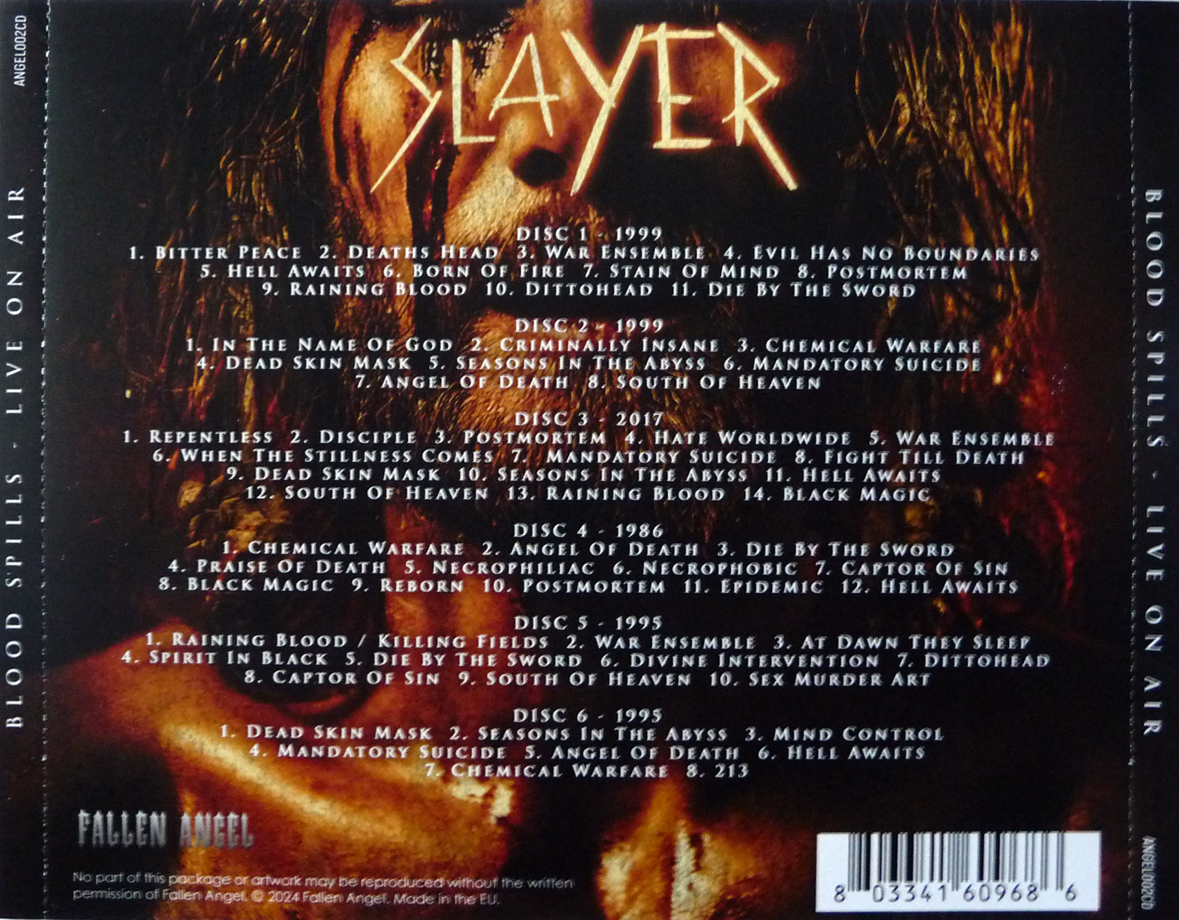 1. Bitter Peace 2. Deaths Head 3. War Ensemble 4. Evil Has No Boundaries 5. Hell Awaits 6. Born of Fire 7. Stain of Mind 8. Postmortem 9. Raining Blood 10. Dittohead 11. Die by the Sword
