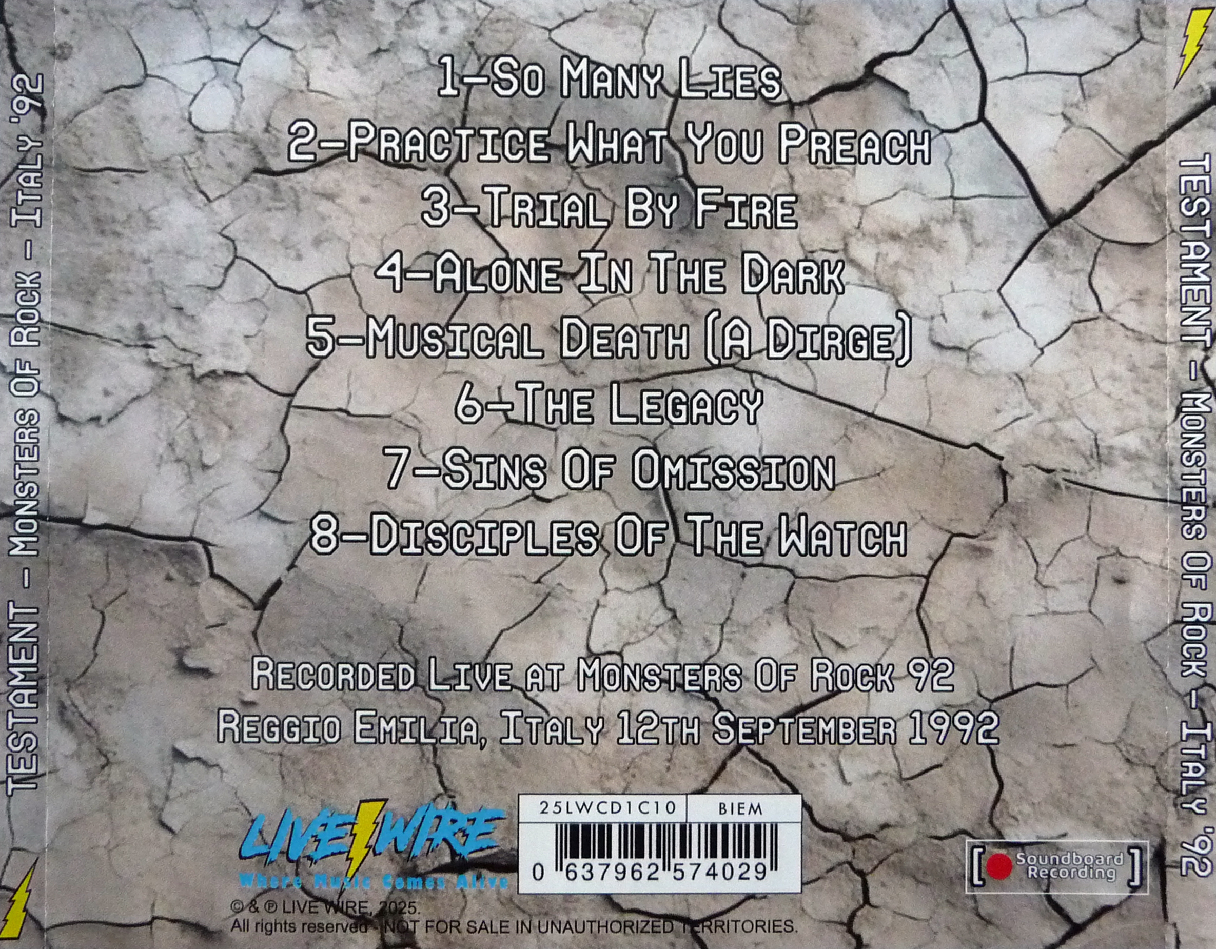 Band name: Testament Date: 12 September 1992 Venue: Arena Campovolo Location: Reggio Emilia, Italy Tour name: The Ritual Event: Monsters of Rock Festival Type: