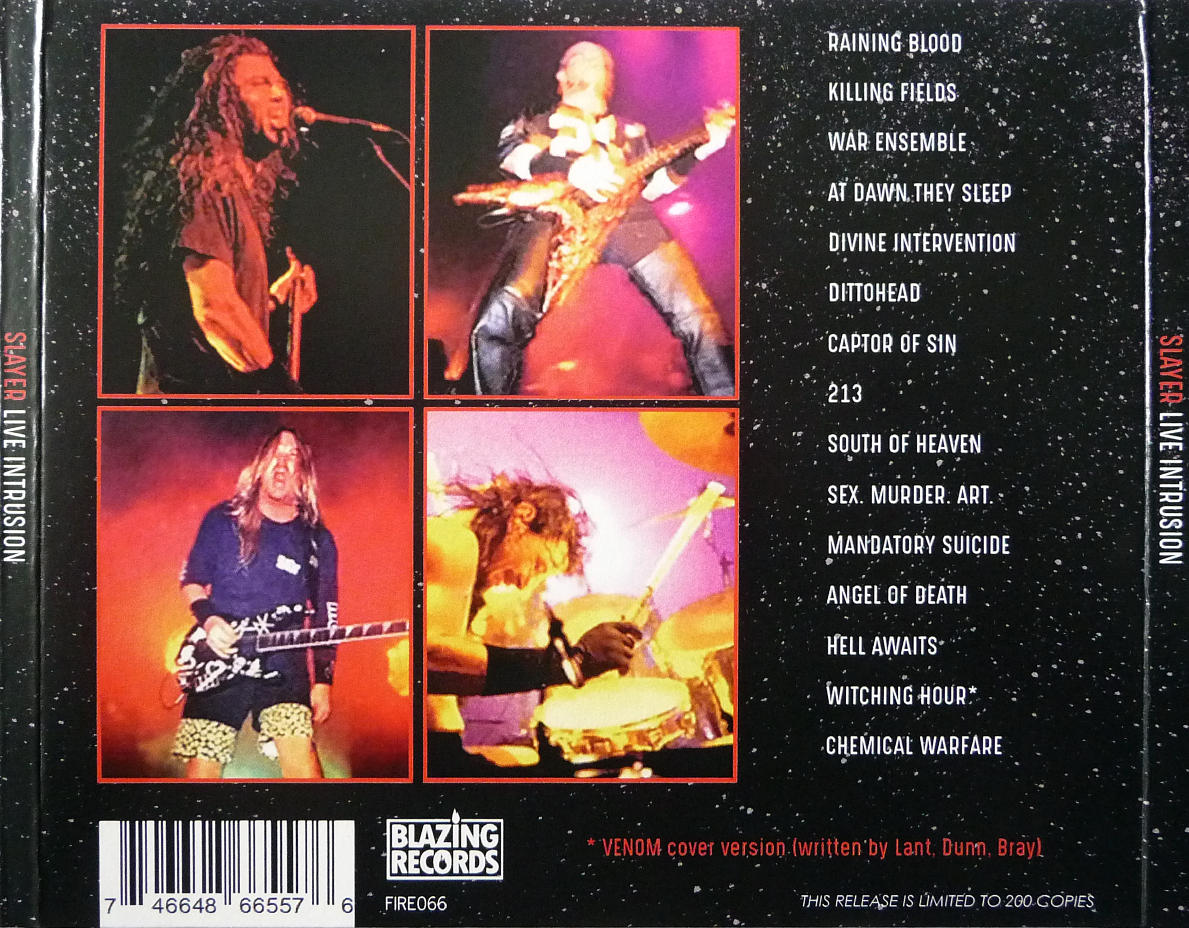1. Raining Blood 2. Killing Fields 3. War Ensemble 4. At Dawn They Sleep 5. Divine Intervention 6. Dittohead 7. Captor of Sin 8. 213 9. South of Heaven 10. Sex, Murder, Art 11. Mandatory Suicide 12. Angel of Death 13. Hell Awaits 14. Witching Hour 15. Chemical Warfare
