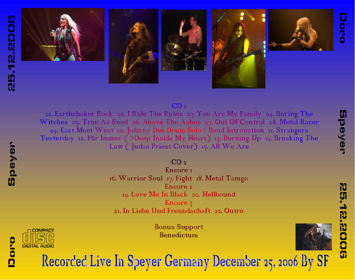 1. Earthshaker Rock 2. I Rule the Ruins 3. You're My Family 4. Burning the Witches 5. True As Steel 6. Above the Ashes 7. Out of Control 8. Metal Racer 9. East Meets West 10. Johnny Dee Drum Solo 11. Strangers Yesterday 12. Für Immer 13. Burn It Up 14. Breaking the Law 15. All We Are