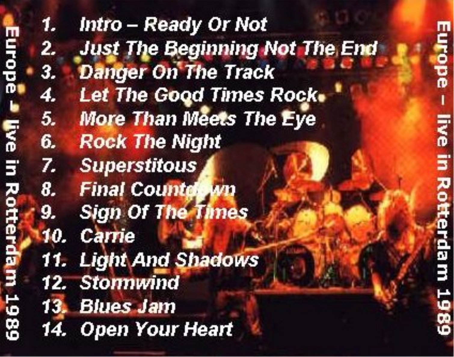 1. Intro 2. Just the Beginning Not the End 2. Danger on the Track 4. Let the Good Times Rock 5. More Than Meets the Eyes 6. Rock the Night 7. Superstitious 8. The Final Countdown 9. Sign of the Times 10. Carrie 11. Light and Shadows 12. Stormwind 13. Blues Jam 14. Open Your Heart