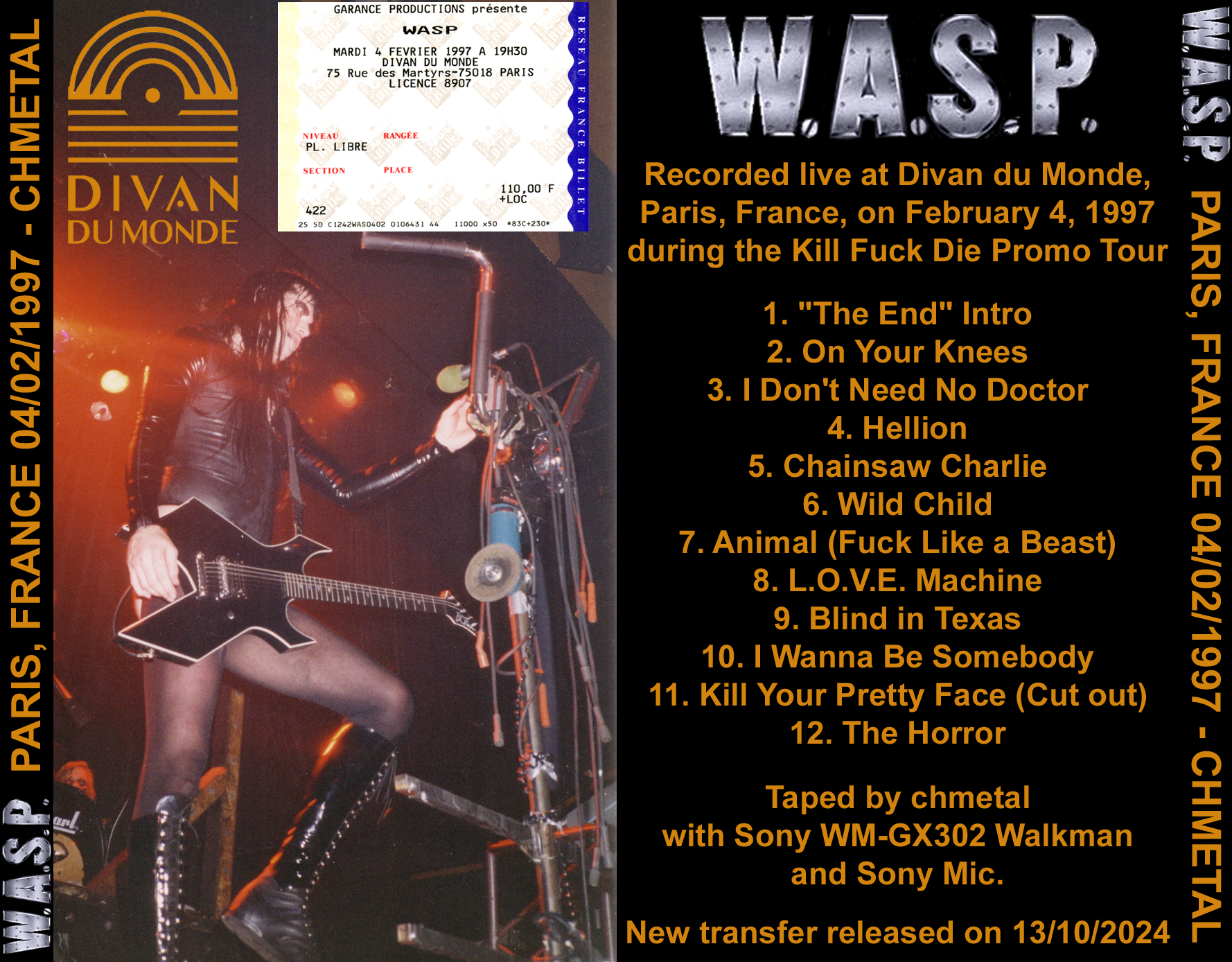 1. "The End" Intro 2. On Your Knees 3. I Don't Need No Doctor 4. Hellion 5. Chainsaw Charlie 6. Wild Child 7. Animal (Fuck Like a Beast) 8. L.O.V.E. Machine 9. Blind in Texas 10. I Wanna Be Somebody 11. Kill Your Pretty Face (Cut out) 12. The Horror