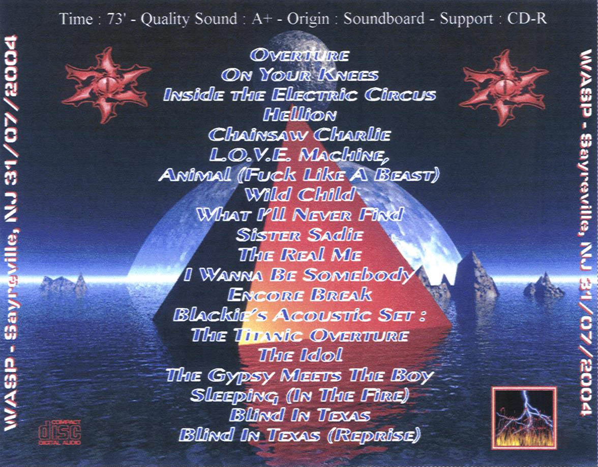 1. Overture 2. On Your Knees 3. Inside the Electric Circus 4. Hellion 5. Chainsaw Charlie (Murders in the New Morgue) 6. L.O.V.E. Machine 7. Animal (Fuck Like a Beast) 8. Wild Child 9. What I'll Never Find 10. Sister Sadie (And the Black Habits) 11. The Real Me 12. I Wanna Be Somebody 13. Encore Break 14. Blackie's Acoustic Set : The Titanic Overture - The Idol - The Gypsy Meets the Boy - Sleeping (In the Fire) 15. Blind in Texas 16. Blind in Texas (Reprise)