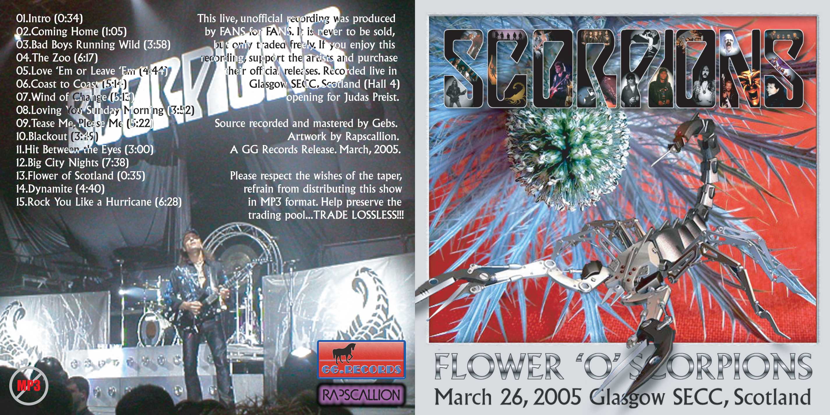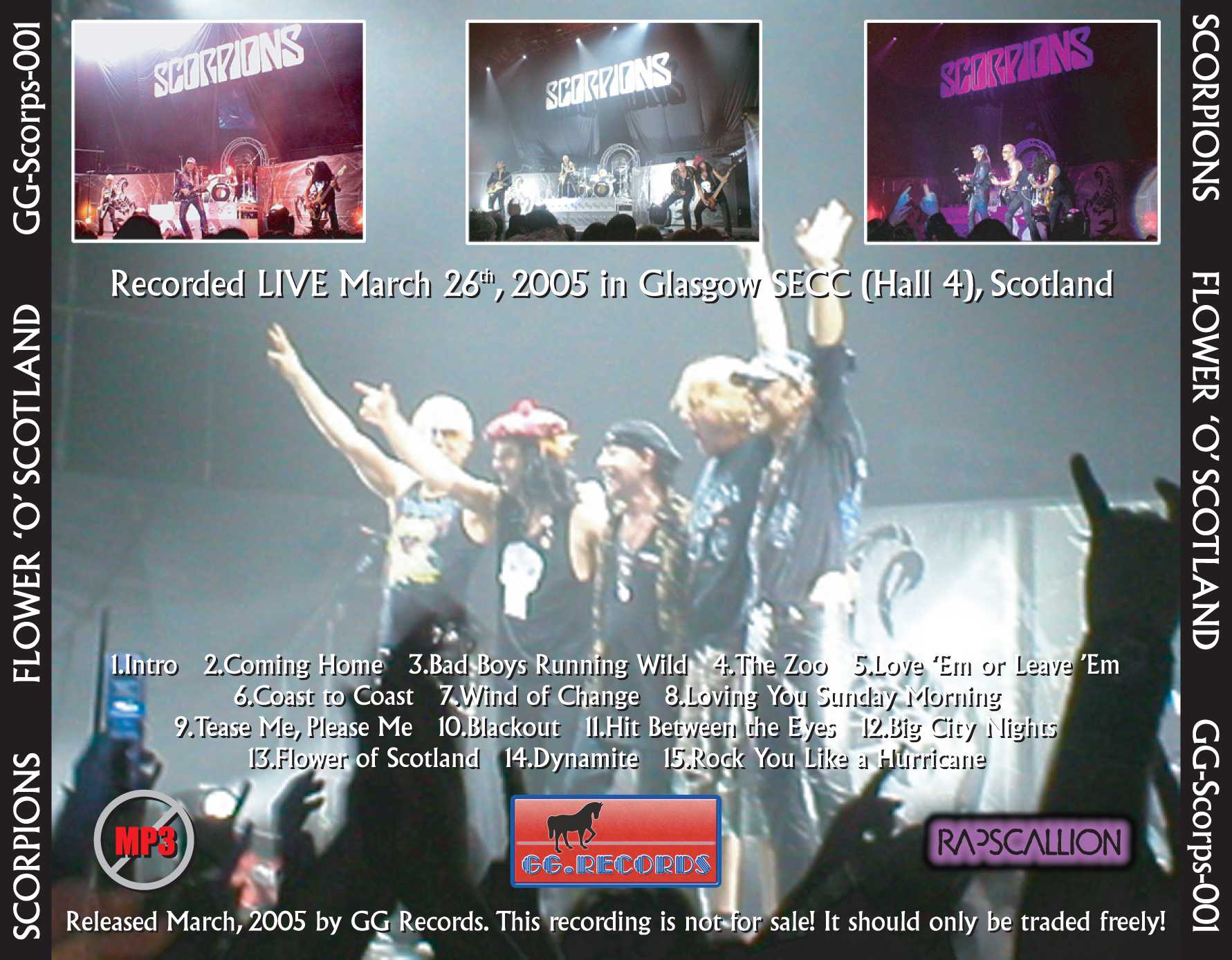 1. Intro 2. Coming Home 3. Bad Boys Running Wild 4. The Zoo 5. Love 'Em or Leave 'Em 6. Coast to Coast 7. Wind of Change 8. Loving You Sunday Morning 9. Tease Me Please Me 10. Blackout 11. Hit Between the Eyes 12. Big City Nights 13. Flower of Scotland 14. Dynamite 15. Rock You Like a Hurricane
