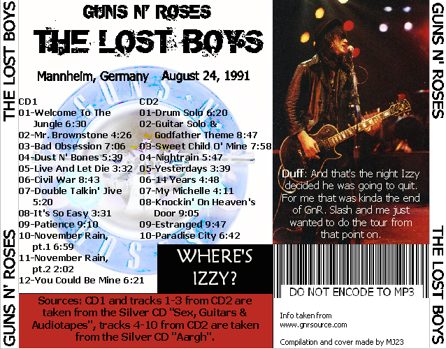 1. Welcome to the Jungle 2. Mr. Brownstone 3. Bad Obsession 4. Dust N' Bones 5. Live and Let Die 6. Civil War 7. Double Talkin' Jive 8. It's So Easy 9. Patience 10. November Rain pt.1 11. November Rain pt.2 12. You Could Be Mine