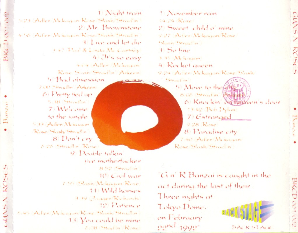 1. Night Train 2. Mr. Brownstone 3. Live and Let Die 4. It's So Easy 5. Bad Obsession 6. Pretty Tied Up 7. Welcome to the Jungle 8. Don't Cry 9. Double Talkin' Jive Motherfucker 10. Civil War 11. Wild Horses 12. Patience 13. You Could Be Mine