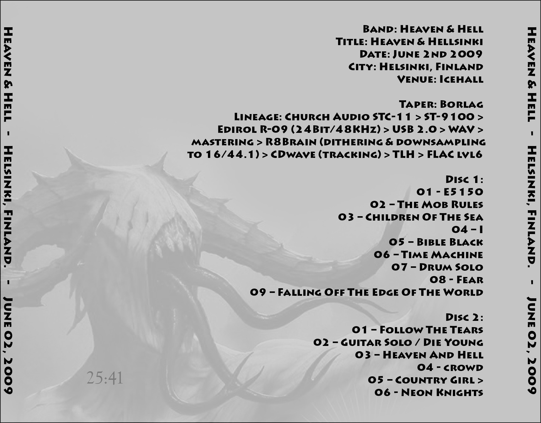 1. E5150 2. The Mob Rules 3. Children of the Sea 4. I 5. Bible Black 6. Time Machine 7. Drum Solo 8. Fear 9. Falling off the Edge of the World