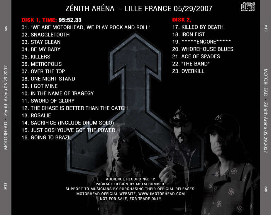 1. "We Are Motörhead, we play rock'n'roll" 2. Snaggletooth 3. Stay Clean 4. Be My Baby 5. Killers 6. Metropolis 7. Over the Top 8. One Night Stand 9. I Got Mine 10. In the Name of Tragedy 11. Sword of Glory 12. The Chase Is Better Than The Catch 13. Rosalie 14. Sacrifice (include Drums Solo) 15. Just Cos You Got the Power 16. Going to Brazil