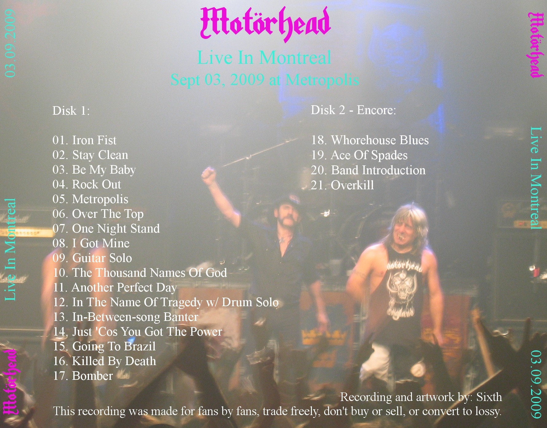 1. Iron Fist 2. Stay Clean 3. Be My Baby 4. Rock Out 5. Metropolis 6. Over the Top 7. One Night Stand 8. I Got Mine 9. Guitar Solo 10. The Thousand Names of God 11. Another Perfect Day 12. In The Name of Tragedy (incl. Drum Solo) 13. In-Between-Song Banter 14. Just 'Cos You Got the Power 15. Going to Brazil 16. Killed by Death 17. Bomber