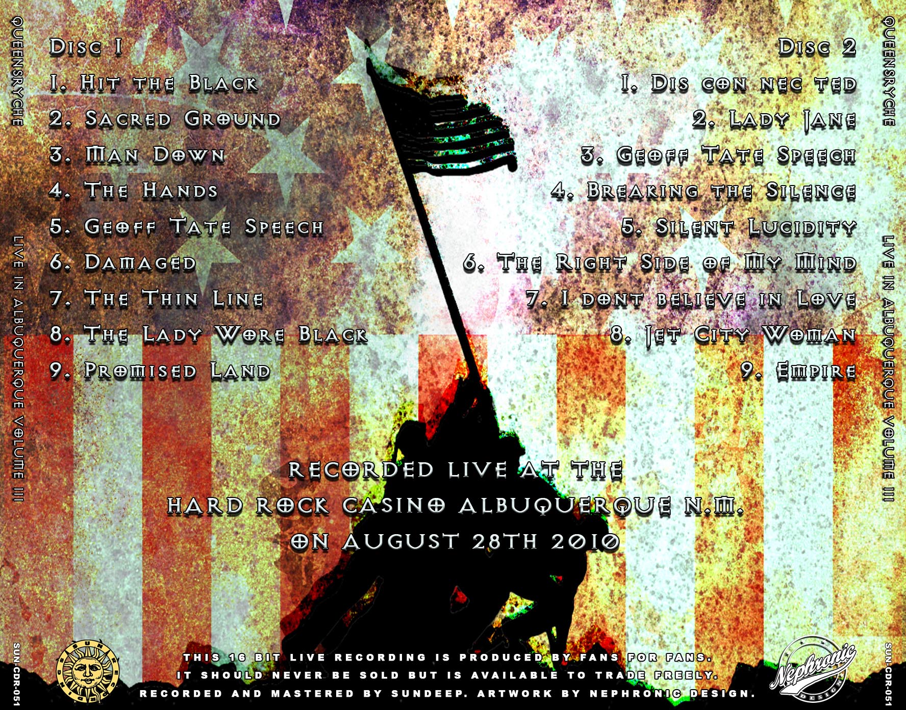 1. Hit the Black 2. Sacred Ground 3. Man Down 4. The Hands 5. Geoff Tate Speech 6. Damaged 7. The Thin Line 8. The Lady Wore Black 9. Promised Land