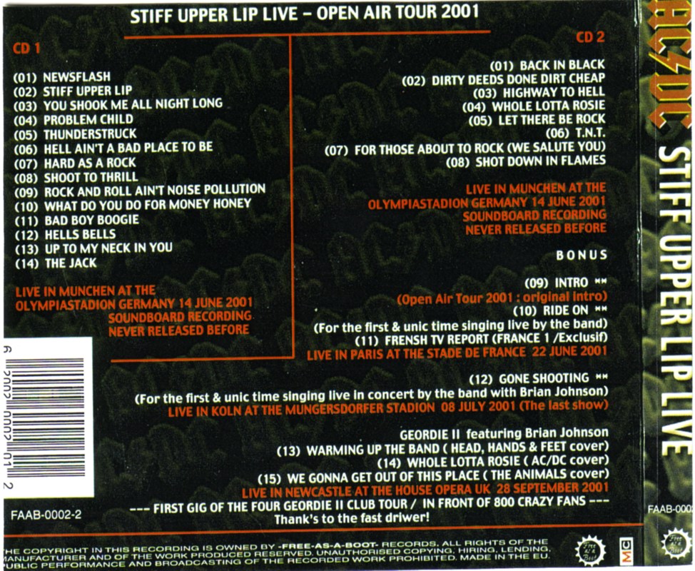 1. Newsflash 2. Stiff Upper Lip 3. You Shook Me All Night Long 4. Problem Child 5. Thunderstruck 6. Hell Ain't a Bad Place to Be 7. Hard as a Rock 8. Shoot to Thrill 9. Rock and Roll Ain't Noise Pollution 10. What Do You Do for Money Honey 11. Bad Boy Boogie 12. Hells Bells 13. Up to My Neck in You 14. The Jack