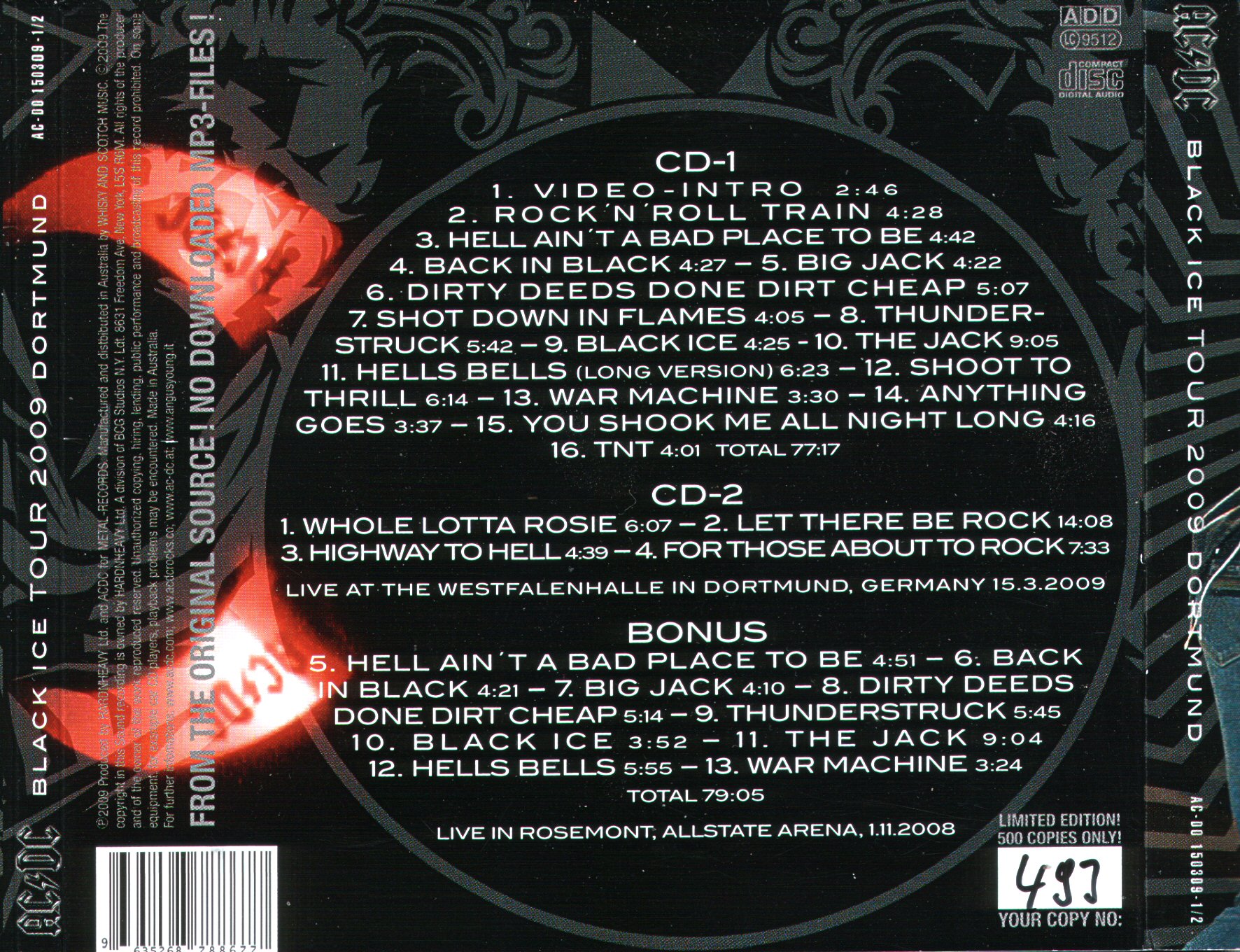 5. Hell Ain´t A Bad Place to Be* 6. Back In Black* 7. Big Jack* 8. Dirty Deeds Done Dirt Cheap* 9. Thunderstruck* 10. Black Ice* 11. She's Got the Jack* 12. Hells Bells* 13. War Machine*