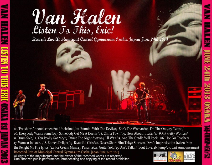 1. Pre-Show Announcement 2. Unchained 3. Runnin' with the Devil 4. She's the Woman 5. I?'m the One 6. Tattoo 7. Everybody Wants Some!! 8. Somebody Get Me a Doctor 9. China Town 10. Hear About It Later 11. (Oh) Pretty Woman 12. Drum Solo 13. You Really Got Me 14. Dance the Night Away 15. I'll Wait