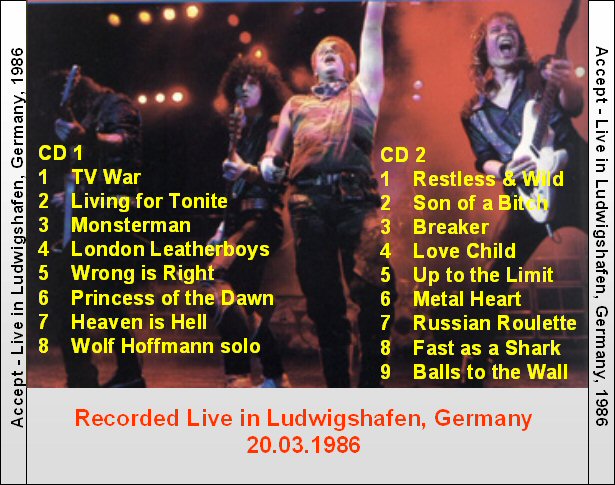 1. TV War 2. Living for Tonite 3. Monsterman 4. London Leatherboys 5. Wrong Is Wright 6. Princess of the Night 7. Heaven Is Hell 8. Wolf Hoffmann Solo 9. Restless and Wild 10. Son of a Bitch 11. Breaker 12. Love Child 13. Up to the Limit 14. Metal Heart 15. Russian Roulette 16. Fast As a Shark 17. Balls to the Wall