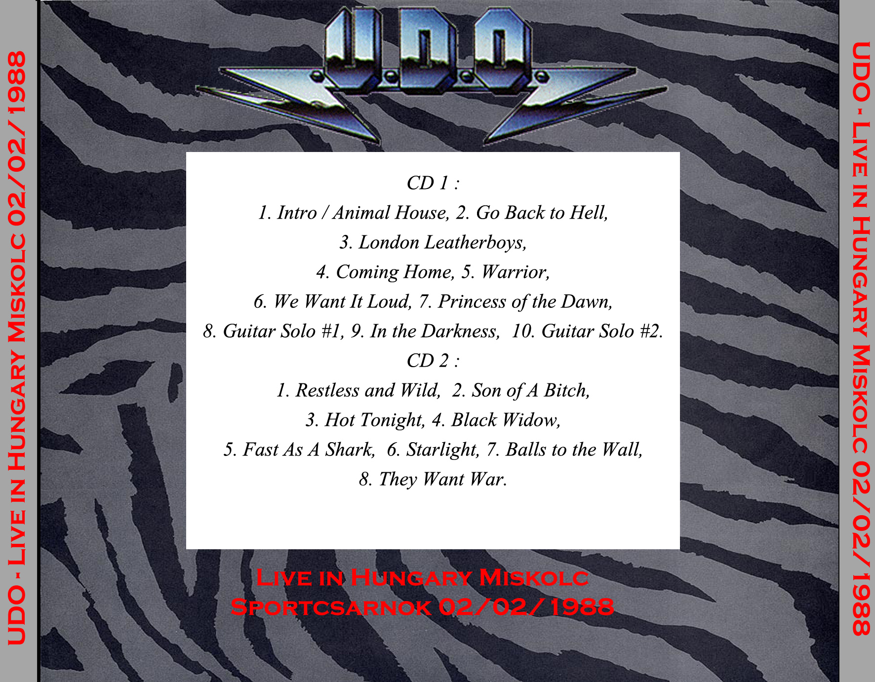1. Intro / Animal House 2. Go Back to Hell 3. London Leatherboys 4. Coming Home 5. Warrior 6. We Want It Loud 7. Princess of the Dawn 8. Guitar Solo #1 9. In the Darkness 10. Guitar Solo #2