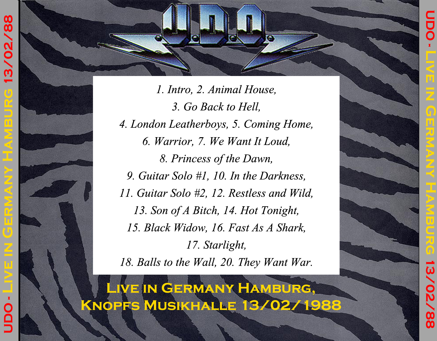 1. Intro 2. Animal House 3. Go Back to Hell 4. London Leatherboys 5. Coming Home 6. Warrior 7. We Want It Loud 8. Princess of the Dawn 9. Guitar Solo #1 10. In the Darkness 11. Guitar Solo #2 12. Restless and Wild 13. Son of a Bitch 14. Hot Tonight 15. Black Widow 16. Fast As a Shark 17. Starlight 18. Balls to the Wall