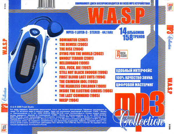 1. Dominator (Album 2007) 2. The Demise (Album 2004) 3. The Rise (Album 2004) 4. Dying for the World (Album 2002) 5. Unholy Terror (Album 2001) 6. Helldorado (1999) 7. Kill Fuck Die (Album 1997) 8. Still Not Black Enough (Album 1995) 9. First Blood Last Cuts (Compilation 1993) 10. The Crimson Idol (Album 1992) 11. The Headless Children (Album 1989) 12. Inside the Electric Circus (Album 1986) 13. The Last Command (Album 1985) 14. W.A.S.P. (Album 1984)