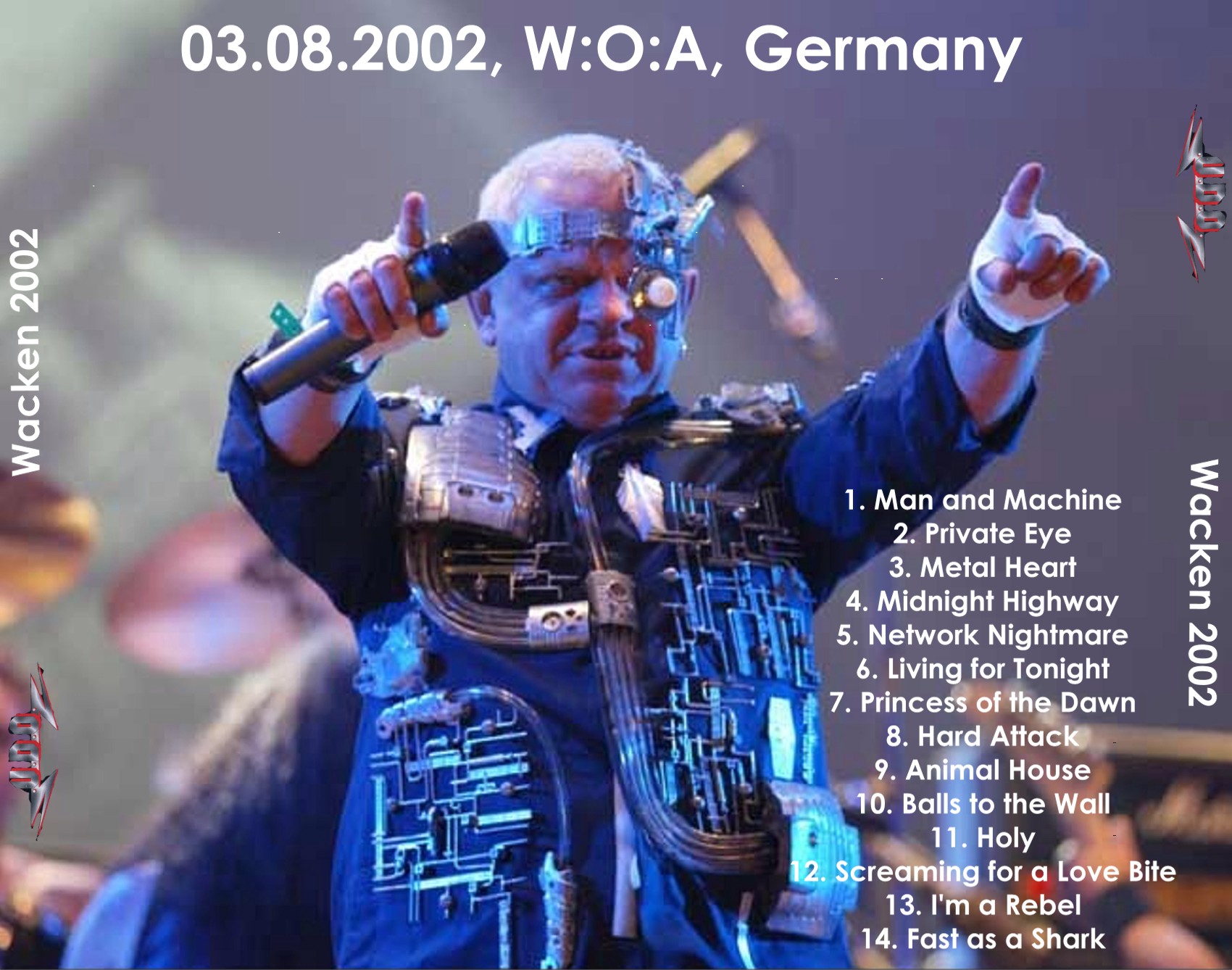 1. Man and Machine 2. Private Eyes 3. Metal Heart 4. Midnight Highway 5. Network Nightmare 6. Living for Tonite 7. Princess of the Dawn 8. Hard Attack 9. Animal House 10. Balls to the Wall 11. Holy 12. Screaming for a Love-Bite 13. I'm a Rebel 14. Fast As a Shark