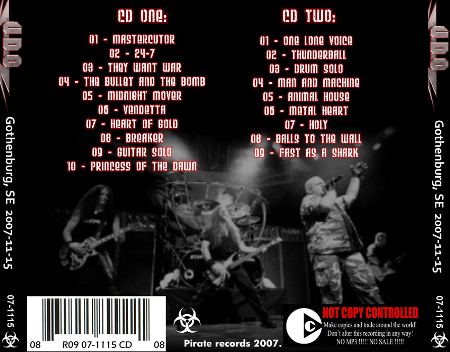 1. One Lone Voice 2. Thunderball 3. Drum Solo 4. Man and Machine 5. Animal House 6. Metal Heart 7. Holy 8. Balls to the Wall 9. Fast As a Shark