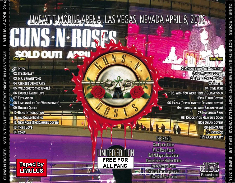 1. Slash Introduction 2. Theme from The Godfather 3. Sweet Child O' Mine 4. Intro/Better 5. Civil War 6. Jam 7. Layla (Instrumental, with Axl on piano) 8. November Rain 9. Knockin' on Heaven's Door 10. Nightrain 11. Patience 12. Paradise City 13. Outro