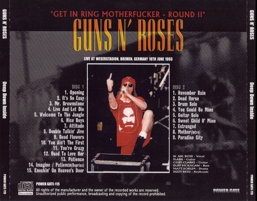 1. Intro 2. It's So Easy 3. Mr. Brownstone 4. Live and Let Die 5. Welcome to the Jungle 6. Nice Boys 7. Attitude 8. Double Talkin' Jive 9. Dead Flowers 10. You Ain't The First 11. You're Crazy 12. Used to Love Her 13. Patience 14. Imagine / Imagine (Reprise) 15. Knockin' on Heaven's Door