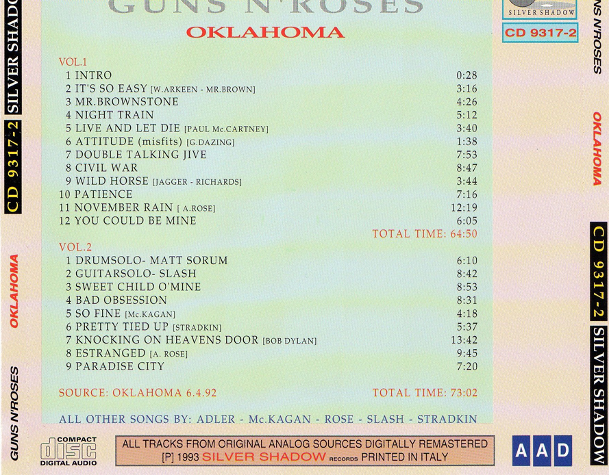 1. Intro 2. It's So Easy 3. Mr Brownstone 4. Night Train 5. Live and Let Die 6. Attitude (Misfits) 7. Double Talking Jive 8. Civil War 9. Wild Horse 10. Patience 11. November Rain 12. You Could Be Mine
