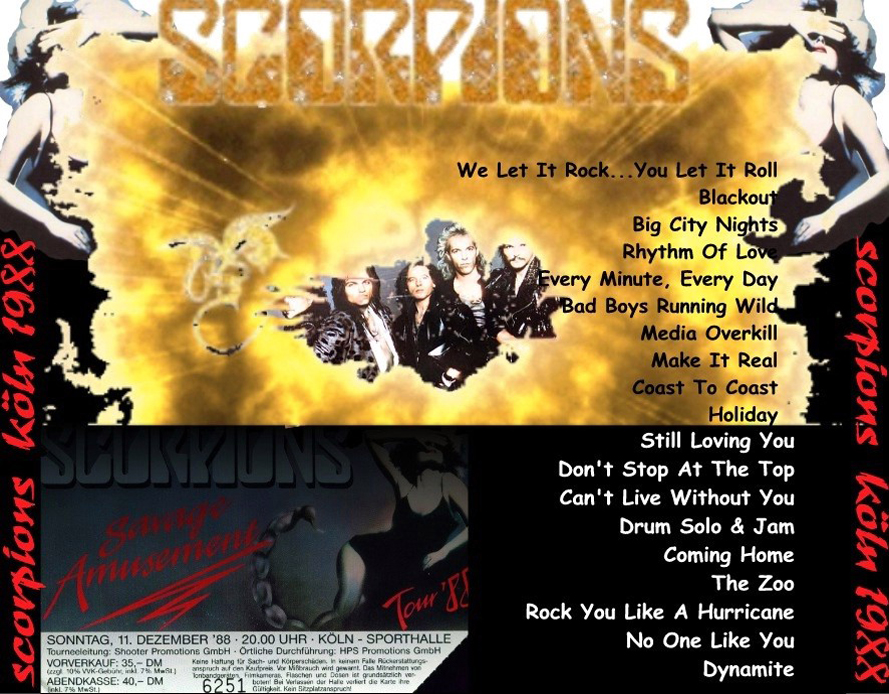 1. Holiday 2. Still Loving You 3. Don't Stop at the Top 4. Can't Live without You 5. Drum Solo & Jam 6. Coming Home 7. The Zoo 8. Rock You Like a Hurricane 9. No One Like You 10. Dynamite