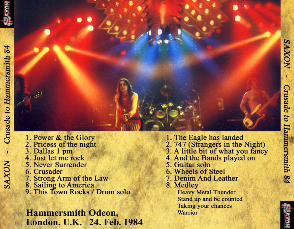 1. Intro / Power and the Glory 2. Princess of the Night 3. Dallas 1pm 4. Just Let Me Rock 5. Never Surrender 6. Crusader 7. Strong Arm of the Law 8. Sailing to America 9. This Town Rocks / Drum Solo