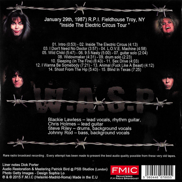 1. Intro 2. Inside the Electric Circus 3. I Don't Need No Doctor 4. L.O.V.E. Machine 5. Wild Child 6. 9.5. - N.A.S.T.Y 7. Guitar Solo 8. Widowmaker 9. Drum Solo 10. Sleeping (In the Fire) 11. Sex Drive 12. I Wanna Be Somebody 13. Animal (Fuck Like a Beast) 14. Shoot from the Hip 15. Blind in Texas