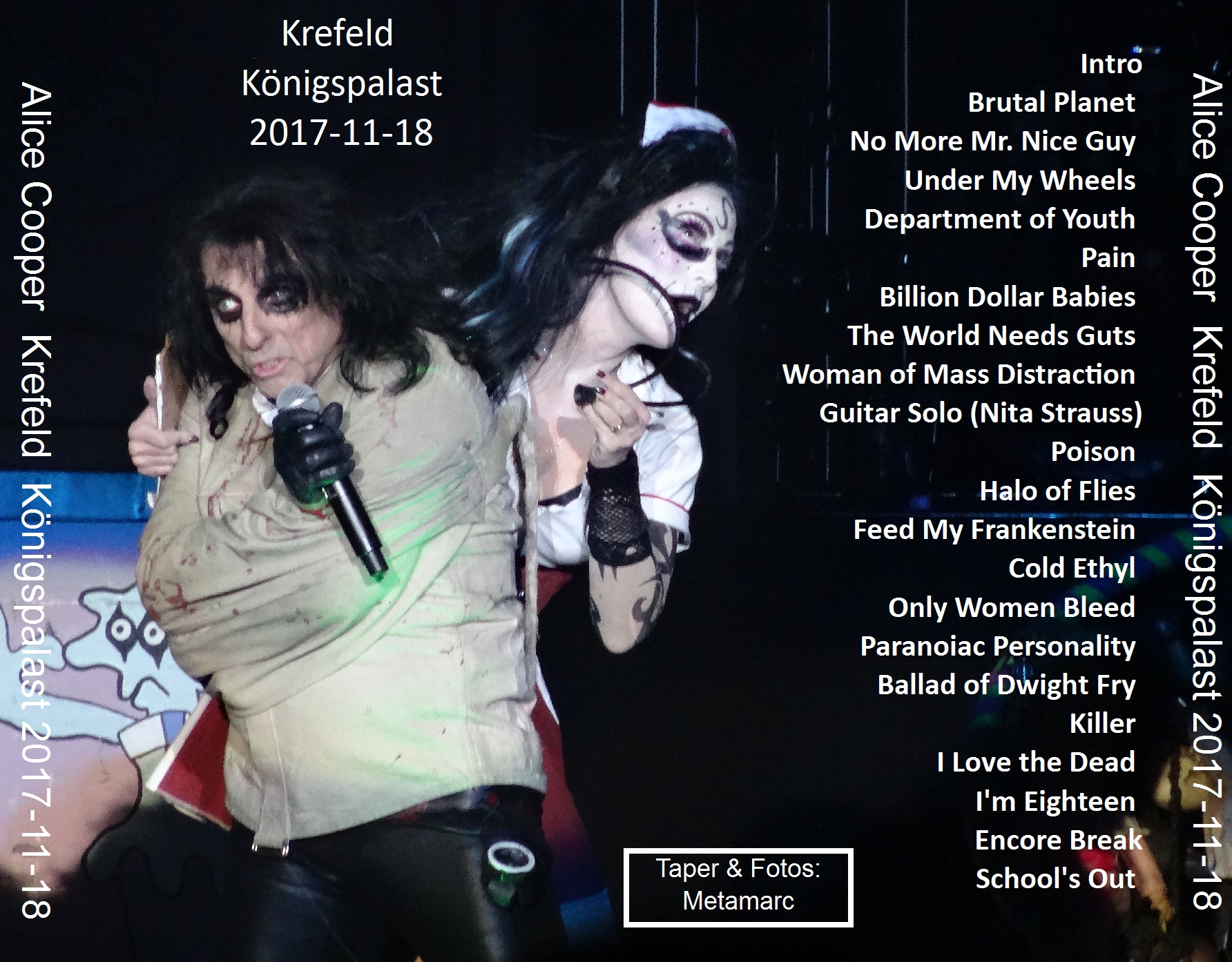 1. Feed My Frankenstein 2. Cold Ethyl 3. Only Women Bleed 4. Paranoiac Personality 5. Ballad of Dwight Fry 6. Killer 7. I Love the Dead 8. I'm Eighteen 9. Encore Break 10. School's Out (w/Doro)