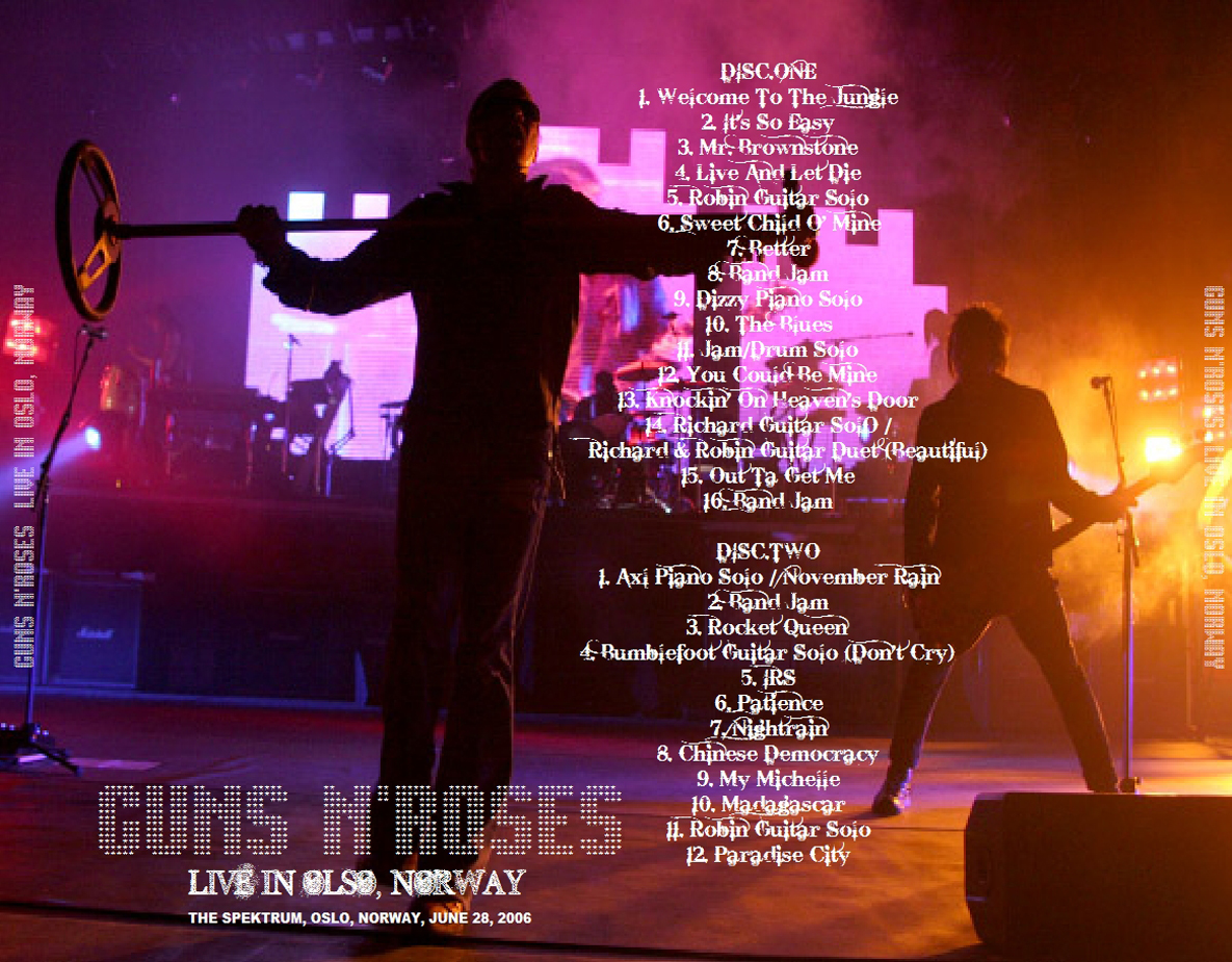 1. Welcome to the Jungle 2. It's So Easy 3. Mr. Brownstone 4. Live and Let Die 5. Robin Guitar Solo 6. Sweet Child O' Mine 7. Better 8. Jam 9. Dizzy Piano Solo 10. The Blues 11. Jam / Drum Solo 12. You Could Be Mine 13. Knockin' on Heaven's Door 14. Richard Guitar Solo,Richard & Robin Guitar Duet (Beautiful) 15. Out Ta Get Me 16. Jam