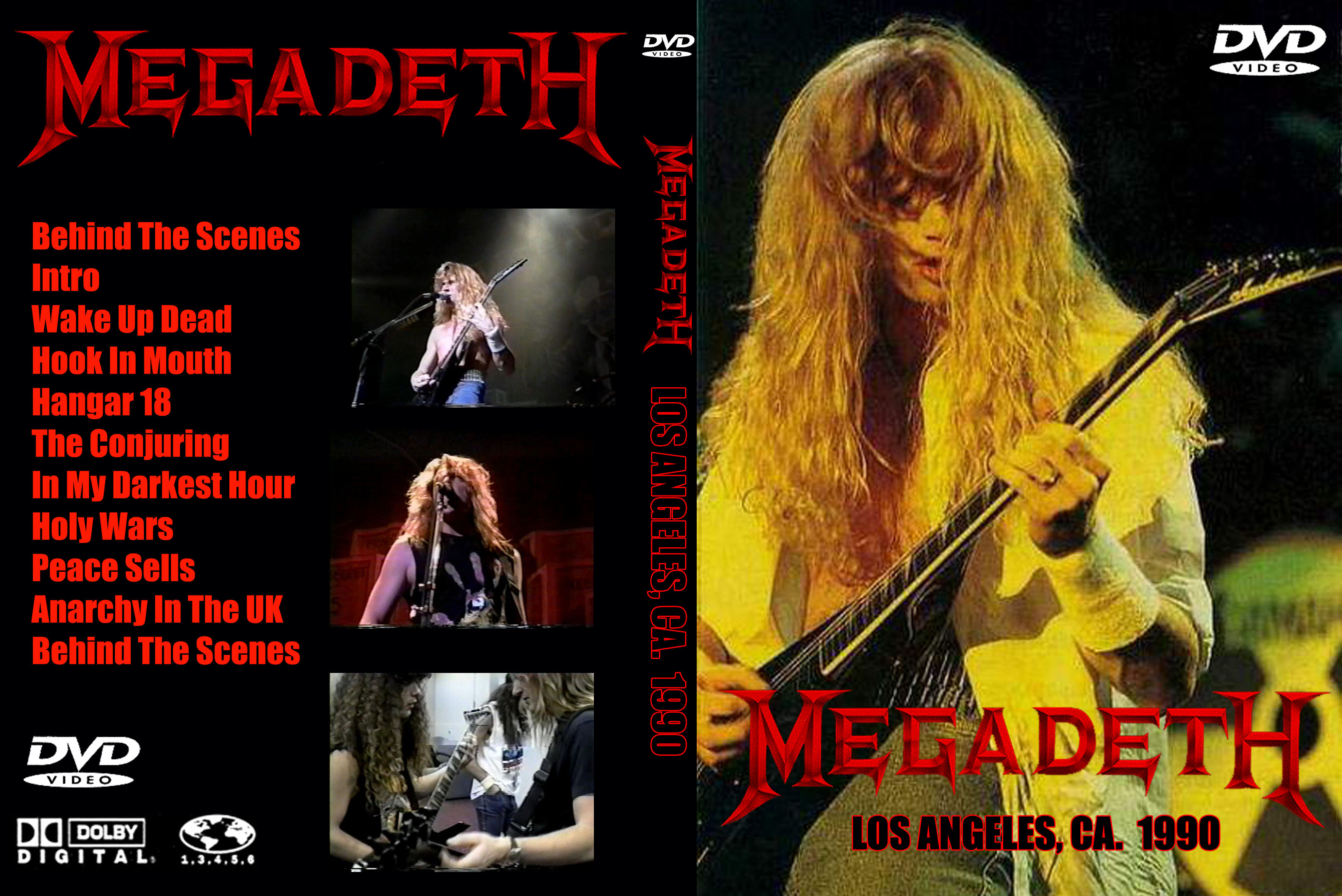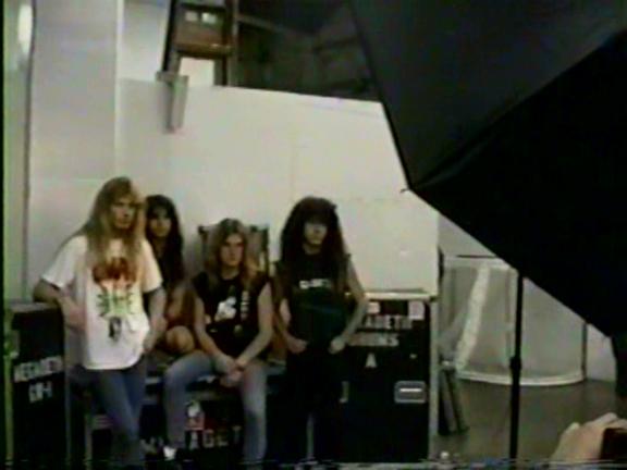 - Dressing room footage, picking out stage clothes - Dave E. talking to their agent about someone getting fired - Marty jamming in the dressing room - Dave E. & Marty jamming in the dressing room - Nick showing off the signs / posters back stage - Dave M. with Benny "THE JET" Urquidez (Martial Arts Superstar) - The band talking about their Laminates and set list - Walking through the crowd on the main floor - Hanging out in the dressing room, getting dressed for the show - Outside with the fuzz and some fans - Fans pulling into the arena - Going through the main hallway - Fans coming into the arena - Back to walking through the main hallways following some chicks - Back in the dressing room, Dave M. signing a contract of some sort - Dave reading a Harley Davidson book Rob Halford gave him - Misc. footage of the boys with their woman - Nick and his girlfriends on the couch - Dave kicks the lady's out of the dressing room for their pre-show ritual jam session - Back stage getting ready to go on - Intro music (barricade) - "Wake Up Dead" (barricade) - "Hook In Mouth" (barricade) - "Hanger 18" (barricade) - "The Conjuring" (barricade / from soundboard) - "In My Darkest Hour" (from soundboard) - "Holy Wars" (barricade) - "Peace sells....But Whose Buying?" (barricade) - Walking back to the dressing room - Driving outside, seeing all the people leaving the arena