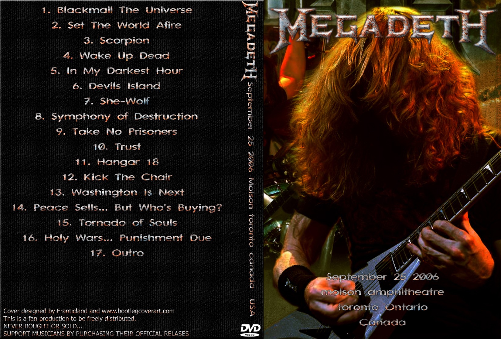1. Blackmail the Universe 2. Set the World Afire 3. The Scorpion 4. Guitar Throw Intermission 5. Wake Up Dead 6. In My Darkest Hour 7. Devils Island 8. She-Wolf 9. Symphony of Destruction 10. Take No Prisoners 11. Trust 12. Hangar 18 13. Kick the Chair 14. Washington Is Next 15. Peace Sells 16. Tornado of Souls 17. Holy Wars 18. Outro