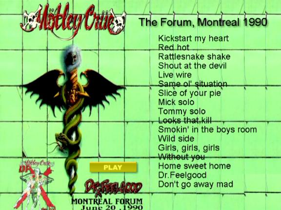 1. Kickstart My Heart 2. Red Hot 3. Rattlesnake Shake 4. Shout at the Devil 5. Live Wire 6. S.O.S. 7. Slice of Your Pie 8. Guitar and Drum Solos 9. Looks That Kill 10. Smokin' in the Boys Room 11. Wildside 12. Girls, Girls, Girls 13 Without You 14. Home Sweet Home 15. Dr. Feelgood 16. Don't Go Away Mad (Just Go Away)