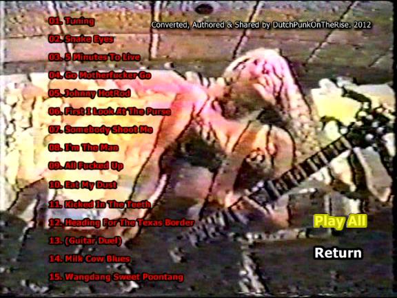 1. Intro / Tuning 2. Snake Eyes 3. 5 Minutes to Live 4. Go Motherfucker Go 5. Johnny Hotrod 6. First I Look at the Purse 7. Somebody Shoot Me 8. I'm the Man 9. All Fucked Up 10. Eat My Dust 11. Kicked in the Teeth 12. Heading for the Texas Border 13. Guitar duel between Blaine & Ruyter 14. Milkcow Blues 15. Wangdang Sweet Poontang