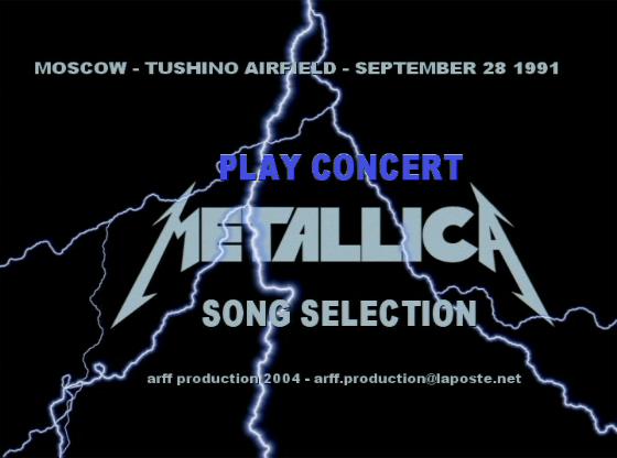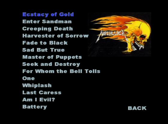 1. Ecstacy of Gold 2. Enter Sandman 3. Creeping Death 4. Harvester of Sorrow 5. Fade to Black 6. Sad But True 7. Master of Puppets 8. Seek and Destroy 9. For Whom the Bell Tolls 10. One 11. Whiplash 12. Last Caress 13. Am I Evil ? 14. Battery