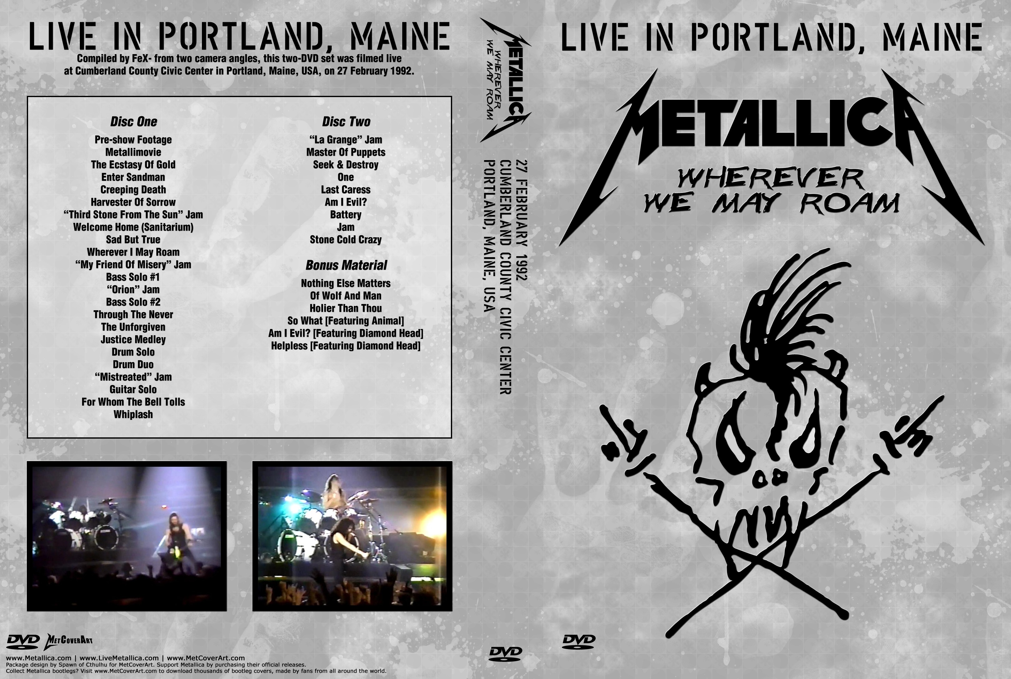 1. Pre-Show Footage 2. Metallimovie 3. The Ecstasy of Gold 4. Enter Sandman 5. Creeping Death 6. Harvester of Sorrow 7. Third Stone from the Sun Jam 8. Welcome Home (Sanitarium) 9. Sad But True 10. Wherever I May Roam 11. My Friend of Misery Jam 12. Bass Solo #1 13. Orion Jam 14. Bass Solo #2 15. Through the Never 16. The Unforgiven 17. Justice Medley 18. Drum Solo 19. Drum Duo 20. Mistreated Jam 21. Guitar Solo 22. For Whom the Bell Tolls 23. Whiplash