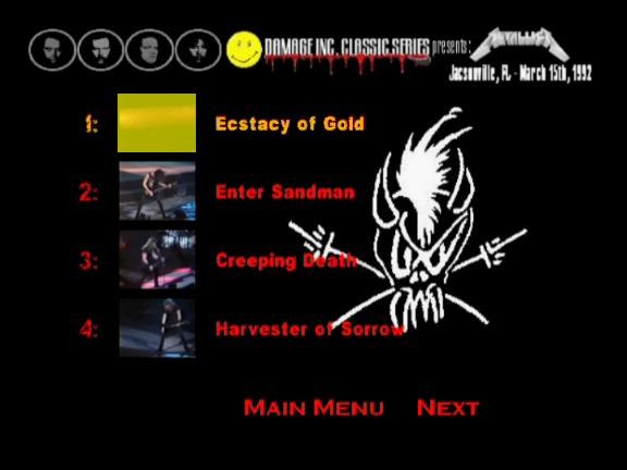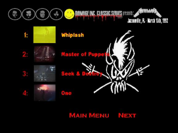 1. Whiplash 2. Master of Puppets 3. Seek and Destroy 4. One 5. Last Caress 6. Am I Evil ? 7. Damage Inc. 8. Stone Cold Crazy