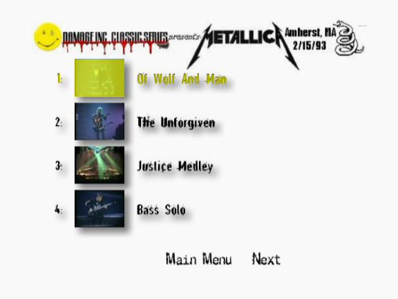 1. Metallimovie 2. The Ecstasy of Gold 3. Enter Sandman 4. Creeping Death 5. Harvester of Sorrow 6. Welcome Home (Sanitarium) 7. Sad but True