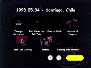 1. Through the Never 2. For Whom the Bell Tolls 3. Fade to Black 4. Master of Puppets 5. Seek and Destroy 6. Battery 7. Nothing Else Matters 8. Wherever I May Roam 9. Last Caress 10. One 11. Stone Cold Crazy