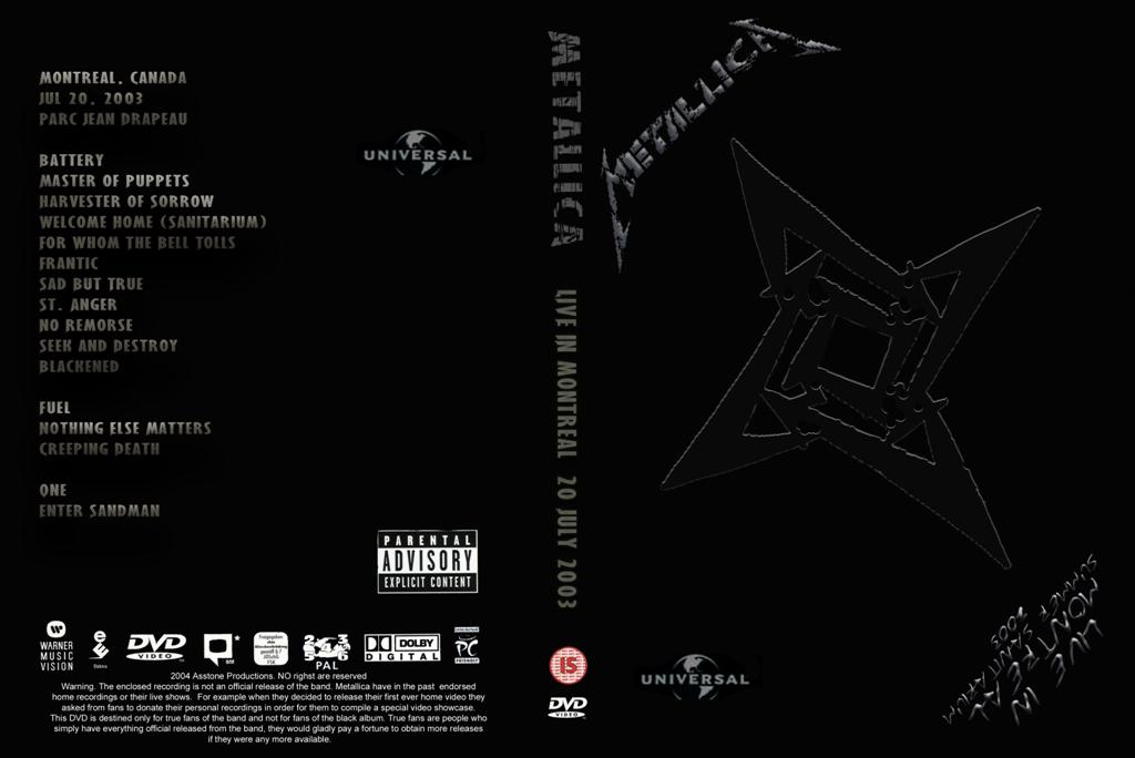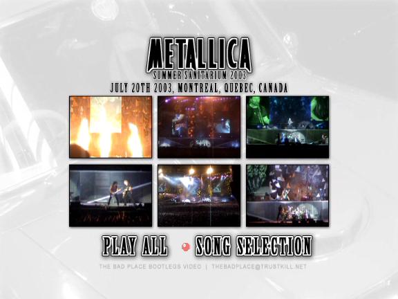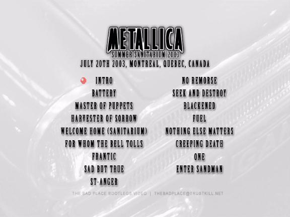 1. Battery 2. Master of Puppets 3. Harvester of Sorrow 4. Welcome Home (Sanitarium) 5. For Whom the Bell Tolls 6. Frantic 7. Sad but True 8. St. Anger 9. No Remorse 10. Seek and Destroy 11. Blackened 12. Fuel 13. Nothing Else Matters 14. Creeping Death 15. One 16. Enter Sandman