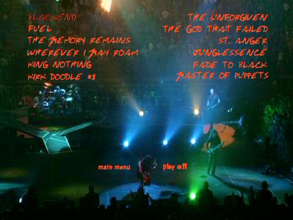 1. Blackened 2. Fuel 3. The Memory Remains 4. Wherever I May Roam 5. King Nothing 6. Kirk Doodle #1 7. The Unforgiven 8. The God That Failed 9. St. Anger 10. Junglessence 11. Fade to Black 12. Master of Puppets